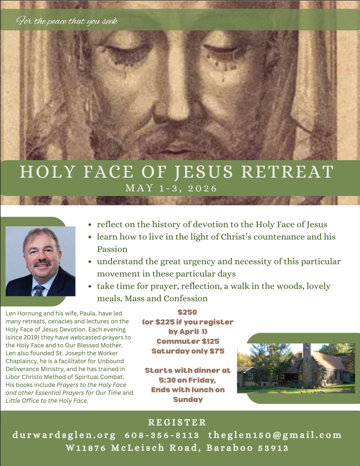 Three day retreat with Paula and Len Hornung who have led many retreats, cenacles and lectures on the Holy Face of Jesus. Learn the reason for the great sense of urgency of this particular movement in these days. His books include “Prayers to the Holy Face and Other Prayers of Our Time.” Mass and confession are included as well as time to reflect in the beautiful setting of The Glen. To register, download and mail the registration form with payment.