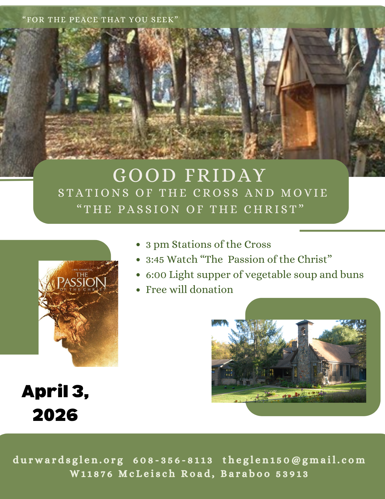 Walk the stations of the cross, watch “The Passion of Christ” and join others for a light supper. Free will offering.