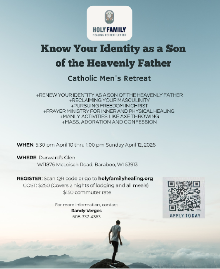 Three day retreat hosted by Holy Family Healing Retreat Center led by Randy Vargas. Renew your identity as a son of the Heavenly Father. Mass, adoration and confession, reflections and healing prayer ministry. . Meals Friday evening-Sunday lunch included. Go to www.holyfamilyhealing.org or call 608-332-4363 to register.