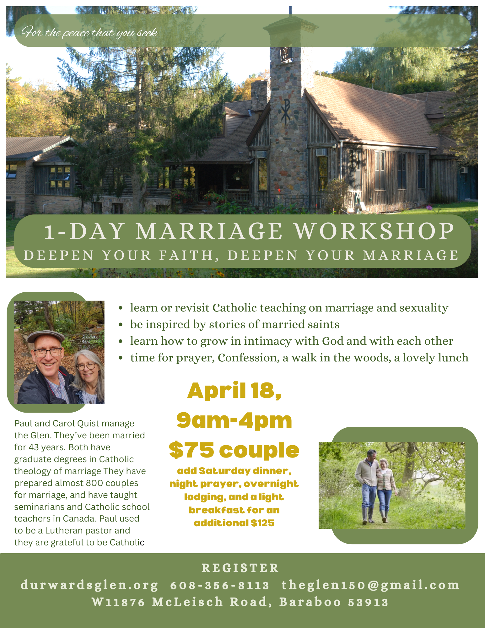 Carol and Paul Quist have been married 43 years. Both have graduate degrees in Theology of Marriage. Learn or revisit Catholic teaching on marriage and sexuality; be inspired by stories of married saints. Grow in intimacy with God and each other. time for prayer, confession, a walk in the woods and a lovely lunch. To register, download and mail the registration form with payment.