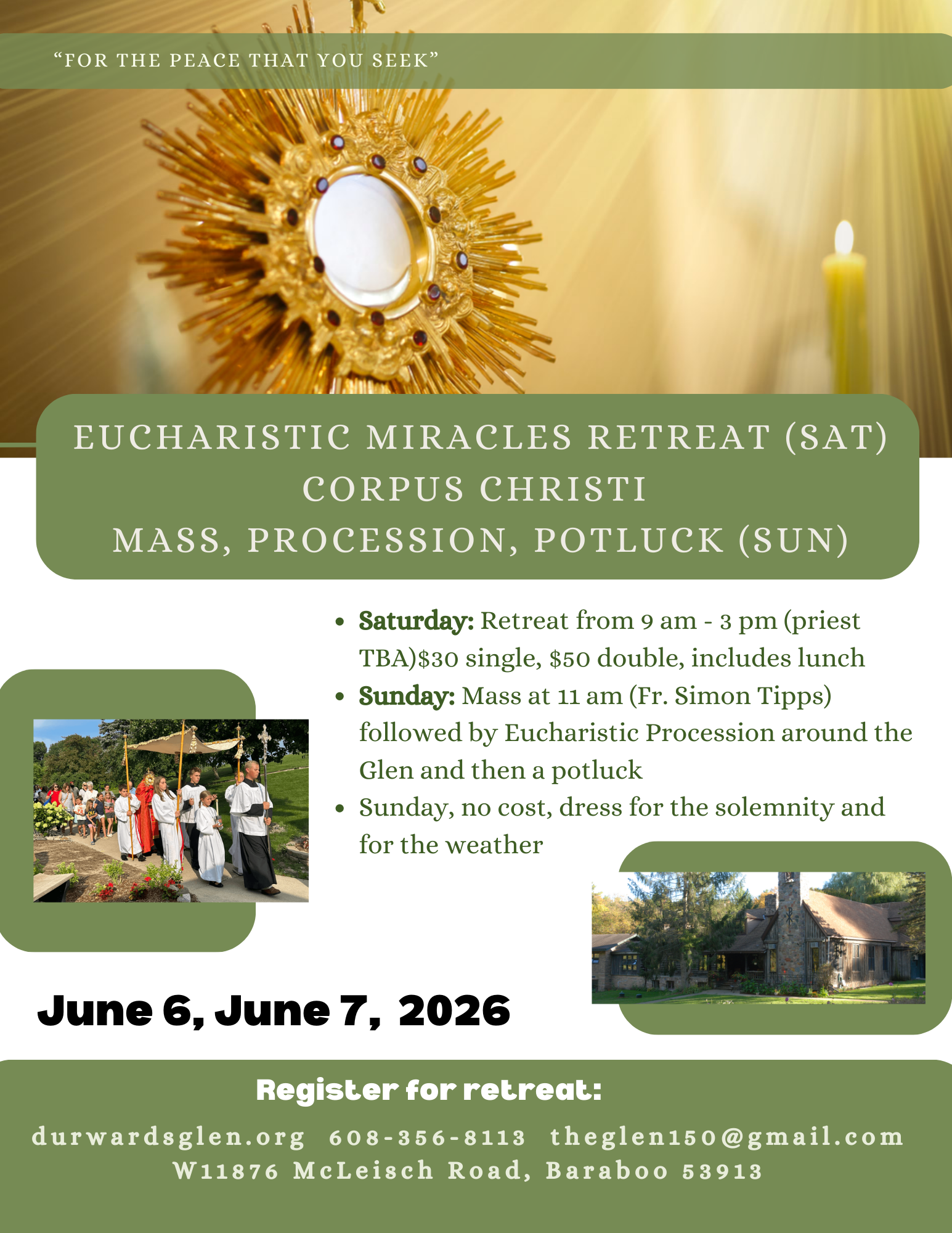 June 6, Saturday, 9am-3pm 1-Day Retreat, . “Eucharistic Miracles.” $30 single; $50 couple.