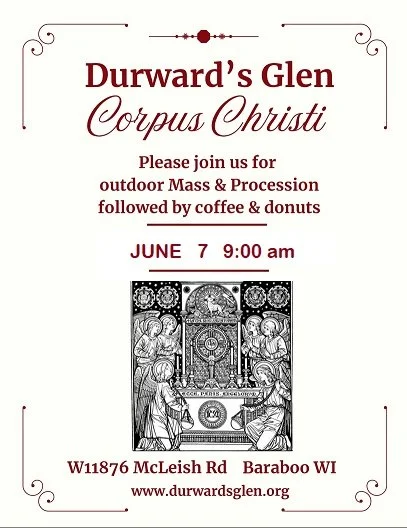 Sunday, June 7, 9:00 am mass led by Father Rick Heilman followed by a traditional Eucharistic procession around the Glen and coffee and donuts.